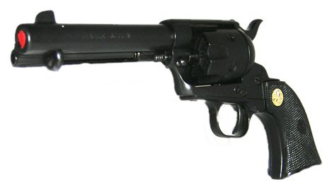 Colt Single Actions are legendary for their blinding speed. A Shootist was just as dangerous with his sixgun in the holster as if it were in his hand. Perhaps even more so. A sixgunner can draw and fire and hit the target with unbelievable speed. This fine blank gun reproduction of the classic western six-shooter single action revolver fires .380 caliber blanks as fast as you can cock the hammer. Pull the hammer back to half cock, open the loading gate, and place six blank cartridges in the chambers as you rotate the cylinder. Features include a working shell ejector, a removable cylinder and polymer checkered grips. Great for practicing cowboy single action shooting. Single Action Barrel Length: 4 3/4" Overall Lenght: 10.5" Weight: 2 lbs Caliber: .380 caliber (9mm) Parts: 25 Finish: BlackFires only specified blank ammo. Can not be made to fire any other ammo, blank or lvie fire Read more...