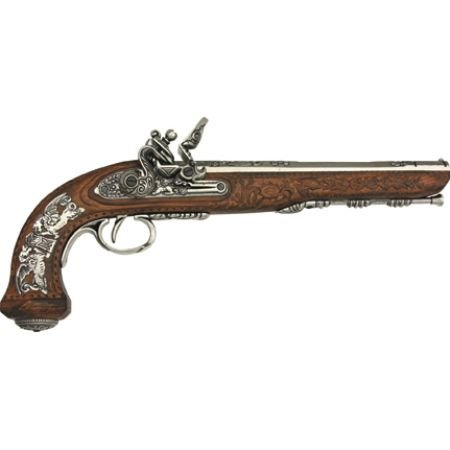 Denix Replicas - Antique Nickel Silver Finish Flintlock Pistol Replica with Wood Grips. Model: DX1084NQ. 1810 French Flintlock Pistol Replica. 15 3/8in. overall. Wood grips with decorative engraving. Antique nickel silver finish barrel and detailed fittings and trim. Country of Origin: SPAIN Read more...